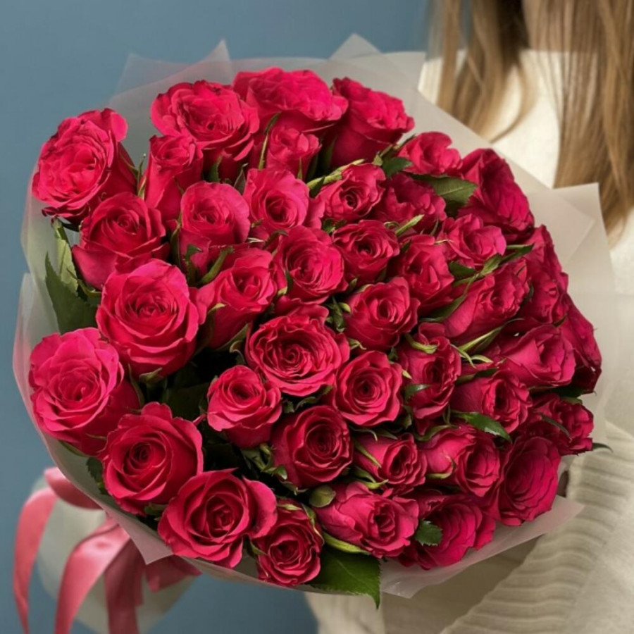 На фото букет из 41 малиновой розы. В составе: роза 41 шт, дизайнерская упаковка 2 шт, атласная лента 1 шт, . Все цветы свежие и ароматные, букет красиво оформлен и отлично подходит для подарка. Доступна доставка цветов или самовывоз.