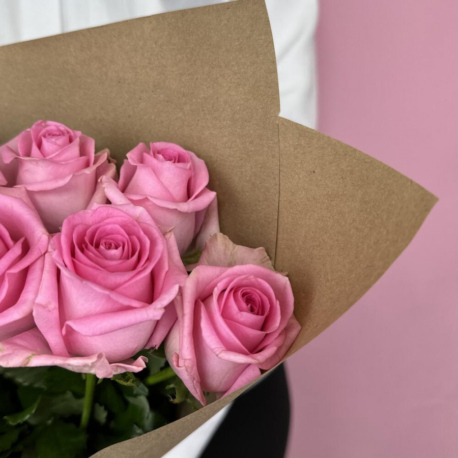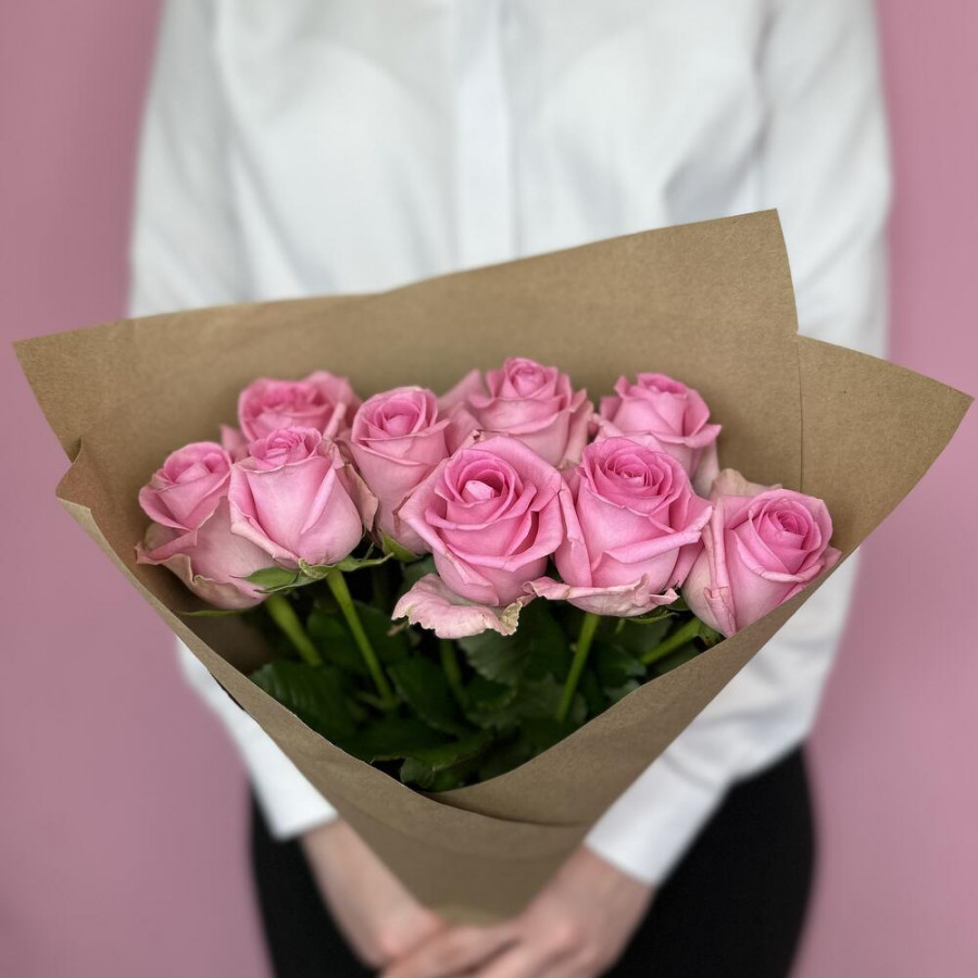На фото букет из 9 розовых роз. В составе: роза 9 шт, крафт-бумага 1 шт, атласная лента 2 шт, . Все цветы свежие и ароматные, букет красиво оформлен и отлично подходит для подарка. Доступна доставка цветов или самовывоз.